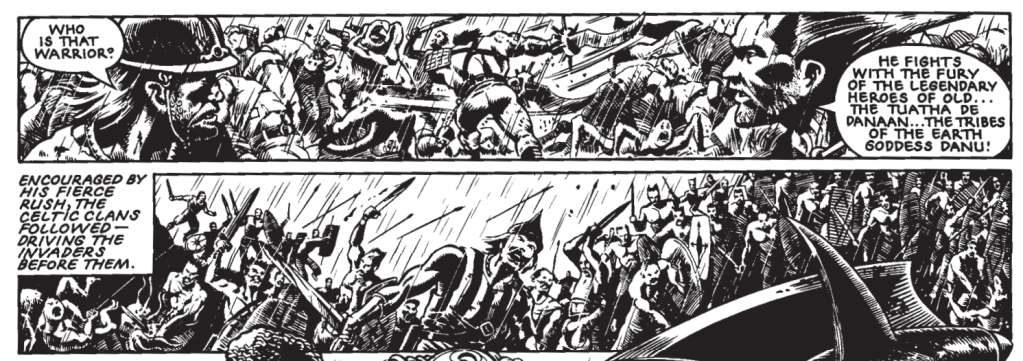Writer Pat Mills does his homework when it comes to the Celts; many elements of this setting are derived from real history or myth. Not just Cuchulain’s riastradh, or warp-spasm. Whenever Sláine kills some great number of people and boasts that he ‘did not think it too many,’ he is quoting from the stories of the Fianna cycle. Part 2 will give further examples.