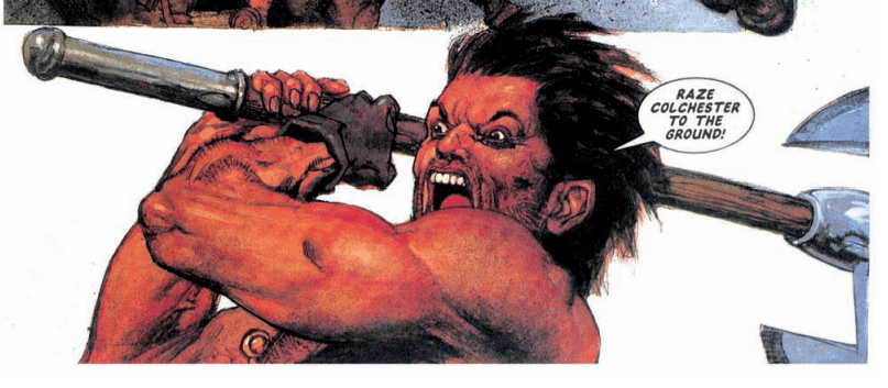 Demon Killer puts the moral ambiguity of Sláine to the fore. Alongside Boudicca, he loots and razes a Roman city, killing masses of innocent people. Mills justifies this in the introduction (justifies it as an artistic choice, I hasten to add) convincingly in my view: