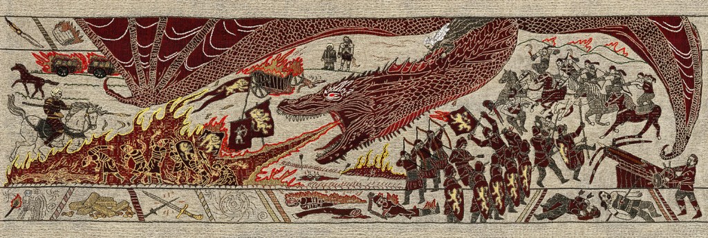 Tyrion began to pace the floor, his hands clasped behind his back. ‘All liberation movements end in totalitarianism. Freeing slaves is a slippery slope. And at the bottom of that slope – genocide. And before you ask, yes,’ he added with a pained smile, gesturing toward the Martin Niemoller and Leni Riefenstahl references scattered about. ‘This story is implying that Dany was, at the end of the day, as bad as Hitler, and by extension that Hitler started out like Dany.’