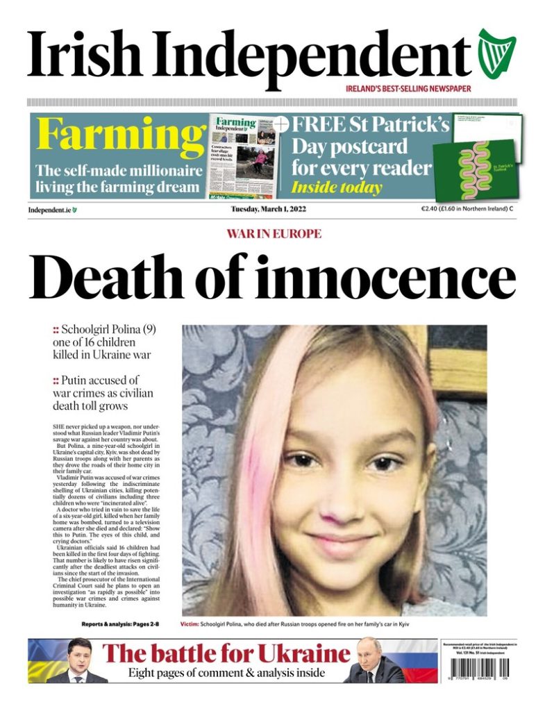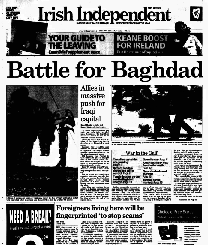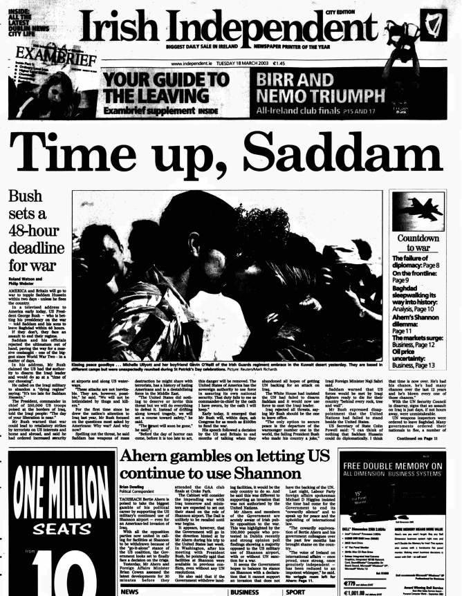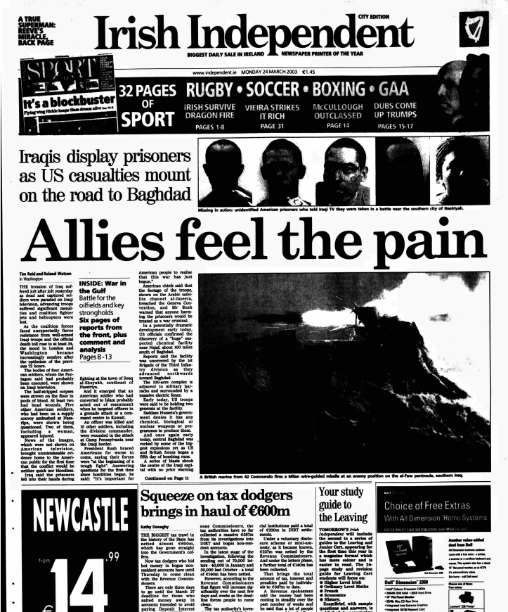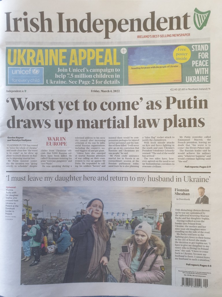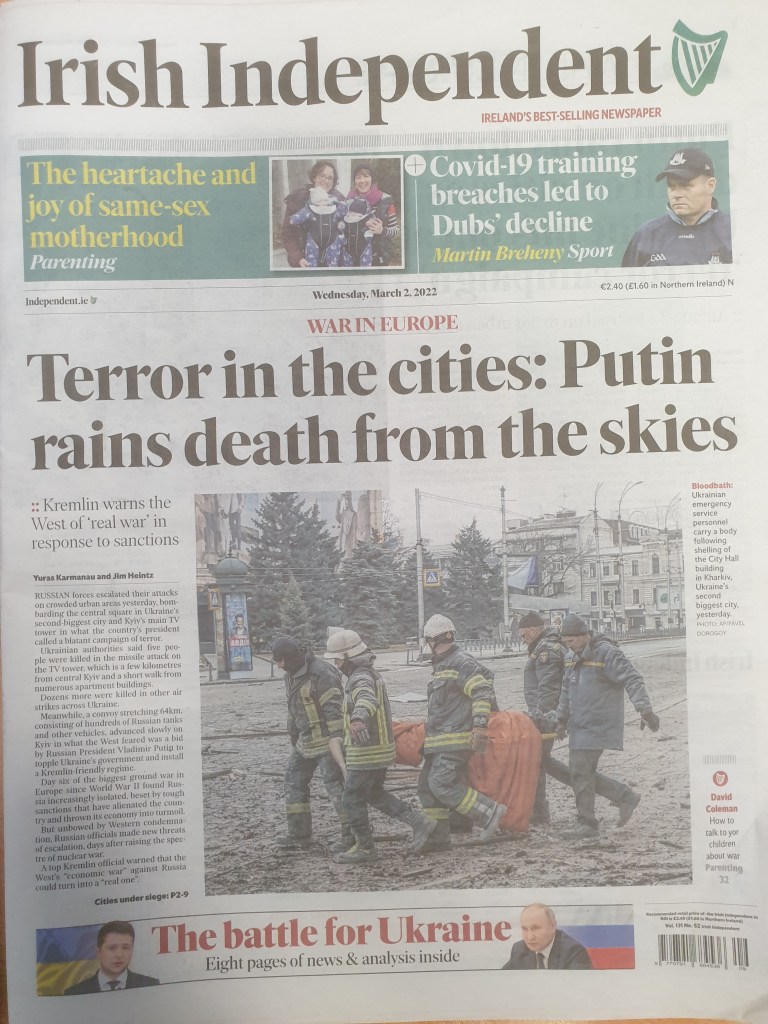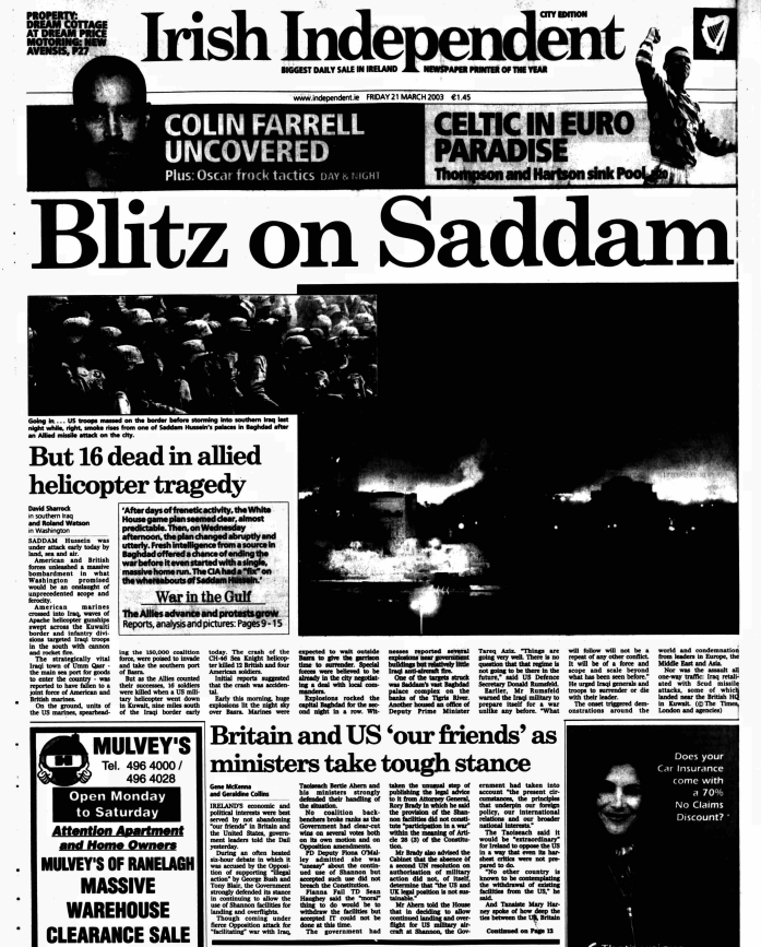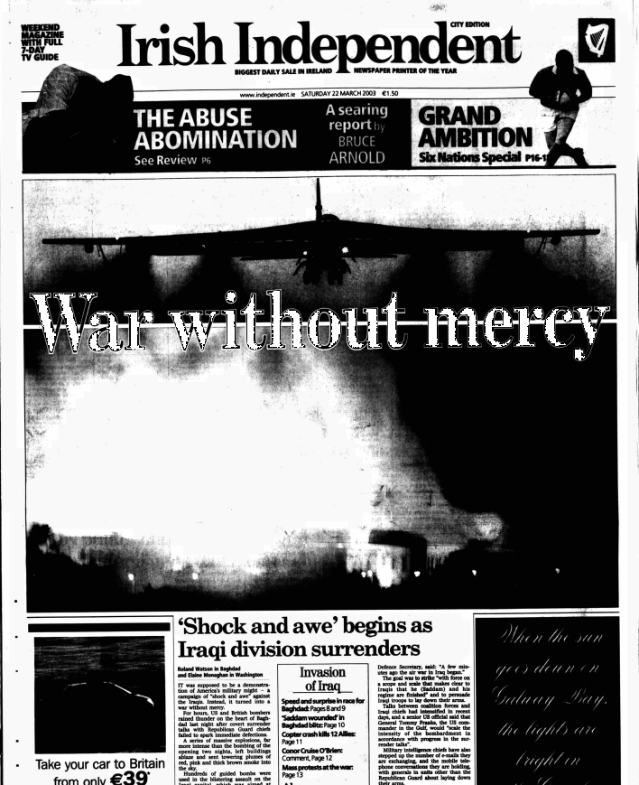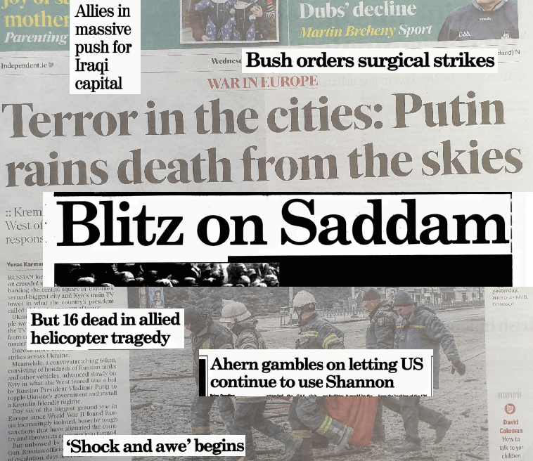 But newspapers did not cover the two events in quite the same way. That’s putting it mildly. I live in Ireland, so here are the headlines I’m seeing from our biggest newspaper. Here are five front pages each from the first week or so of the Iraq War (March 2003) and of the Ukraine War (Feb-March 2022). No further comment from me. The bias speaks for itself.