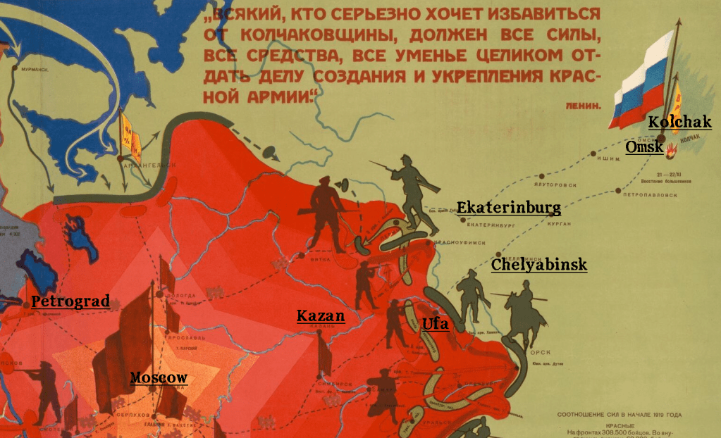 Regardless, the Whites had struck a heavy blow on the Eastern Front. The Ural Mountains had been re-conquered for counter-revolution, and the Allies were staking a million rifles on the victory of Admiral Kolchak. By this time, as we will see in the next few posts, the threats to the Soviet Republic on other fronts had multiplied and grown.