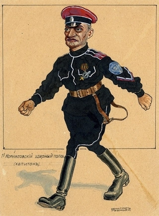The Red Guards, rising from the slums and shop floors, were going south to fight an army that was their opposite in every way. A force called the Volunteer Army, three or four thousand strong, had gathered by the Don River for one purpose: to crush the October Revolution. It was made up mostly of officers and cadets. Over one in five of these men were members of the hereditary nobility – who made up only 1.3% of the population at the time. It’s entirely possible that the Volunteer Army contained as many generals as privates.[3] They were known by a nickname that was just a few weeks old – the White Guards.