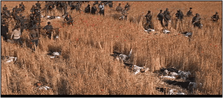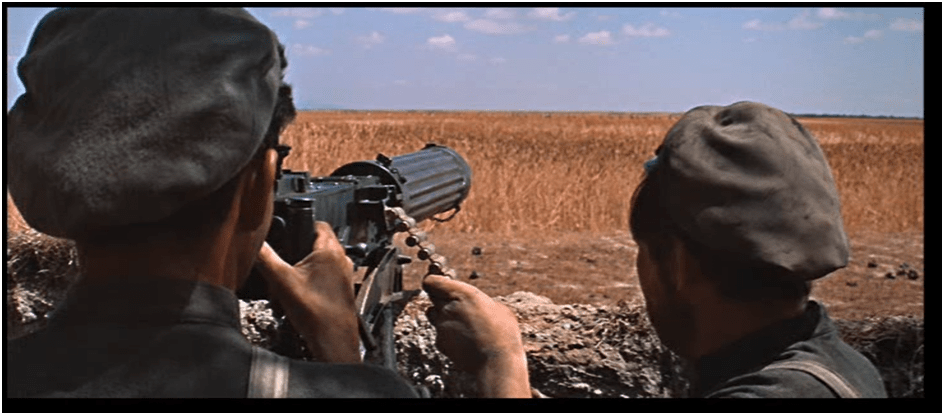 [i] The incident in the novel on which this scene is based is longer and more involved. In both versions, a poor officer stands on a barrel to address the mutineers, only to fall victim to a slapstick accident followed by a rifle shot. In the novel this guy was a smug agent of Kerensky’s Provisional Government, and the guys who kill him are a specific hardcore bandit-like group, not the general mass of deserters.