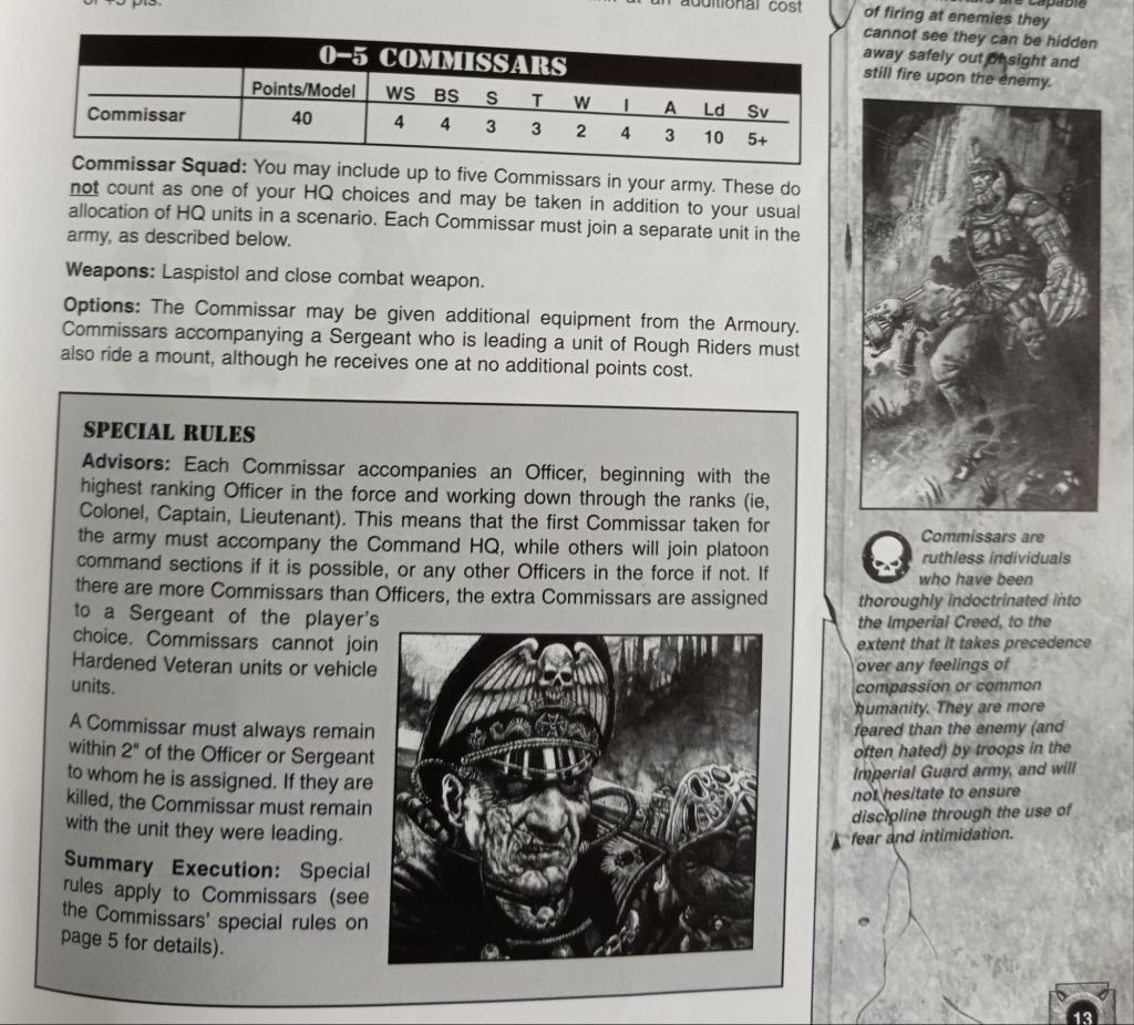 The section on Commissars from the Warhammer 40,000 3rd Edition Imperial Guard codex (1999), contemporary with Necropolis. Images and text belong to Games Workshop ltd