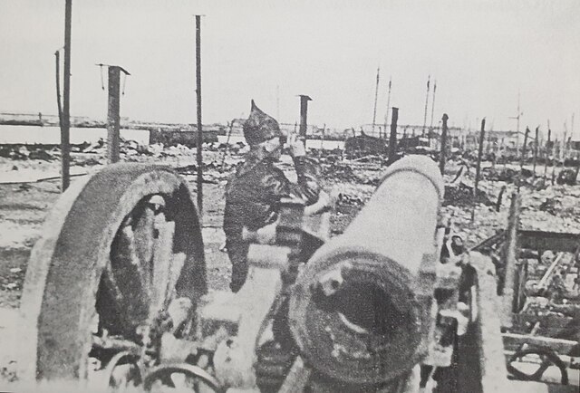 But the great White attack ran into a level of Red resistance the Whites had never seen before. The tank ‘Generalissimo Suvorov’ was destroyed by a Red armoured car bearing the name ‘Antichrist.’ Another tank (‘Ataman Ermak’) ended up crashing into a regimental bathhouse, where it kept up fire until a Red cannon blasted six shells into it from a distance of ninety metres. A White horse battery ran into the shock troops of the veterans from Siberia, who showed them an unexpected and terrible weapon: two volleys from flamethrowers, which sent them fleeing in panic, dropping their weapons. [10]