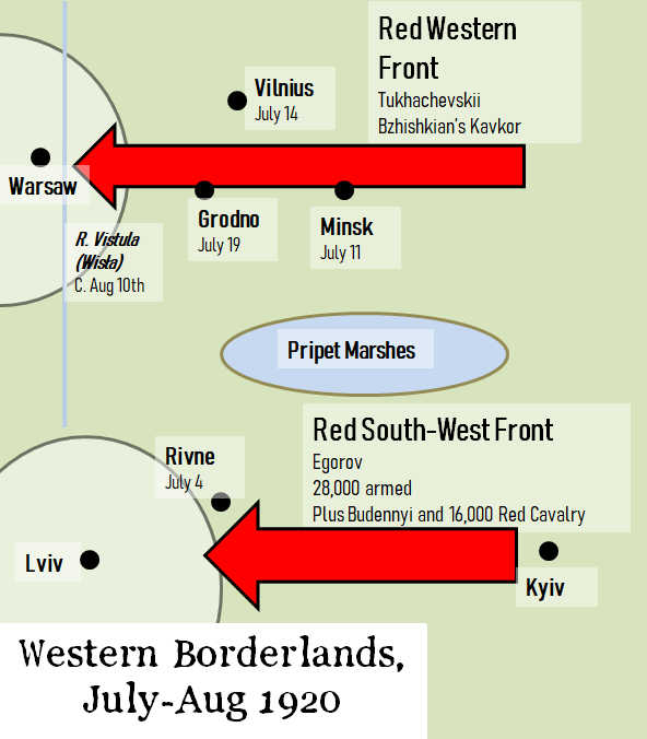 From July 19th to August 7th the Communist International held its Second Congress, a bigger and more impressive affair than the First Congress back in March 1919. Among the 220 delegates was Alfred Rosmer who has given us an often-quoted description of a large map of Eastern Europe that was on display outside Lenin’s office. Visitors watched as little flags were moved across it to mark the positions of the armies; in July, all the red flags were moving west. ‘The advance of the Red Army was stunning; it was developing at a pace which nonplussed professional soldiers ,as only anarmy born of revolutionary enthusiasm is able to do.’ Tukhachevksii’s Western Front took Minsk on July 11th, Vilnius on July 14th, Grodno on July 19th, crossed the Bug River on August 1st and by August 10th was closing in on Warsaw. [15] Some of Hyak Bzhishkian’s Kavkor had in fact run on ahead, west of Warsaw.