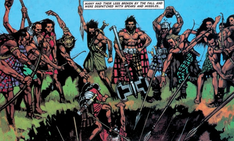 Sláine is in nothing but a loincloth, slaughtering guys in armour – this image of the wild reckless Celtic warrior is complicated by the fact that real Celtic warriors hid behind massive shields and specialised in hit-and-run attacks