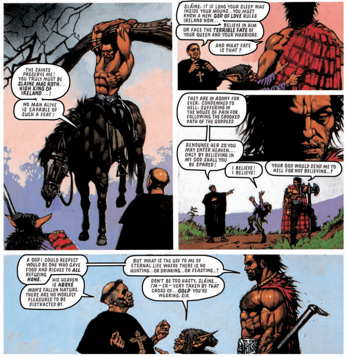 There is a little epilogue where Sláine returns to Ireland to find that his whole world has vanished with the passing of the years. This is brilliant, based on the myth ‘Oisín and St Patrick’ (In Gods and Fighting Men but also online here). In this story a legendary Celtic warrior argues with a Christian saint. It’s absolutely brilliant. The debate between Sláine and the priest is a faithful and creative interpretation of such ancient stories. There’s real authenticity in this little epilogue.
