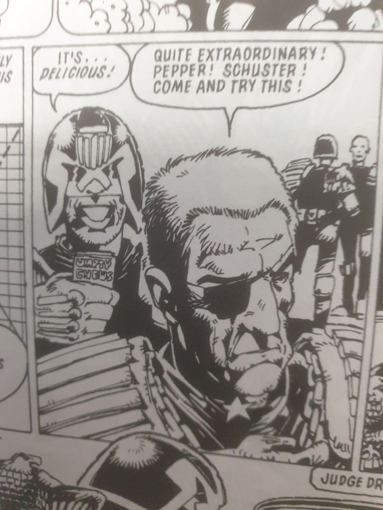 Of the one-offs, far and away the best was the one about Uncle Umpty’s candy. This is so funny and so sad at the same time. It’s very short but it feels like there’s a lot in it. A kind, whimsical and talented old man invents a range of sweets that taste unspeakably wonderful and aren’t addictive or harmful in any way. On principle Dredd does not approve. But on tasting it, Dredd declares ‘It’s delicious!’ and actually smiles. But this little story sums up how absolutely pathological the society and culture of Mega-City One are: people go mad for Uncle Ump’s candy, leading to a breakdown in law and order. The judges take extreme measures against this wonderful old man just to ensure that his candy is gone forever.