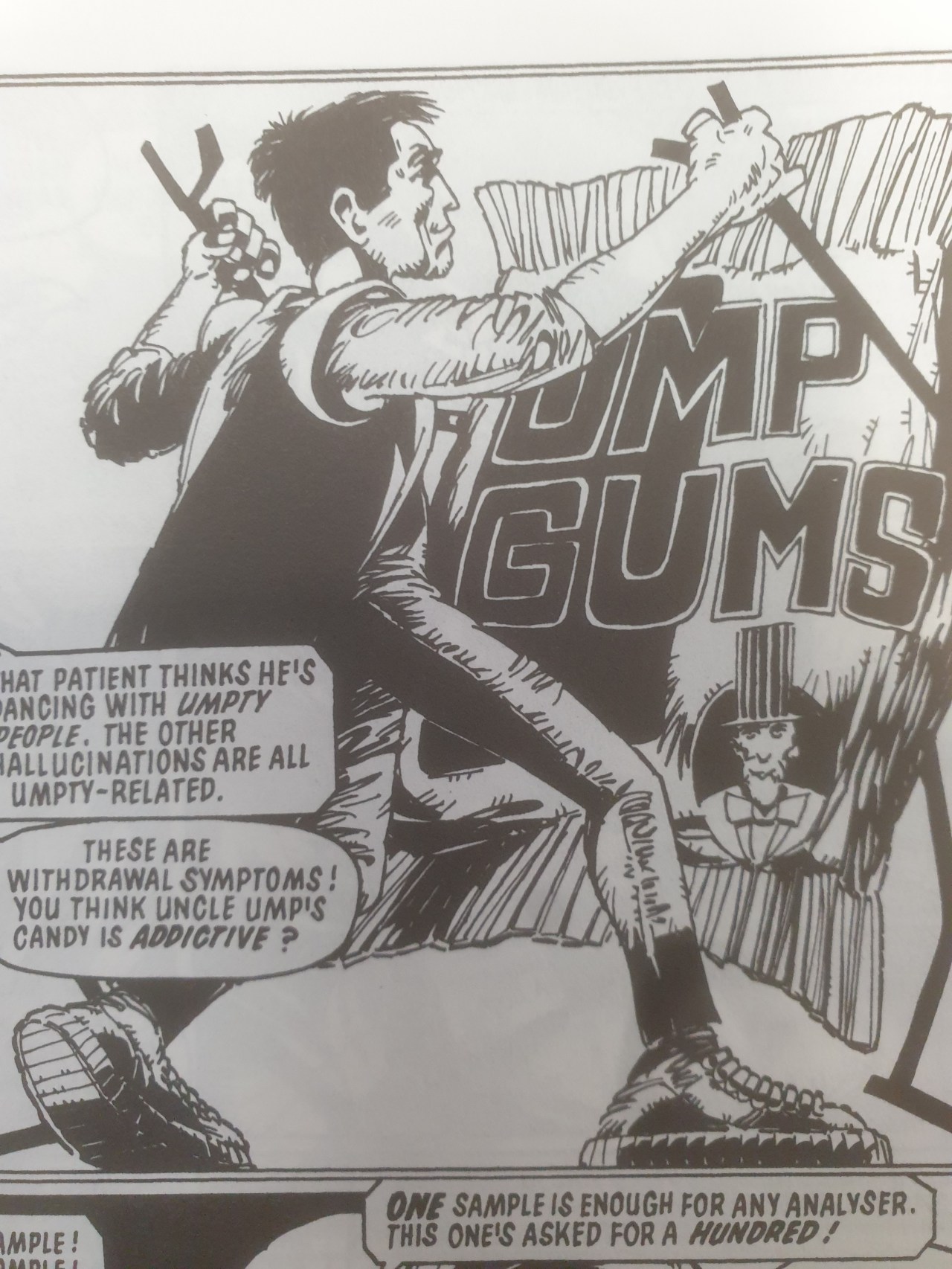 The people of Mega-City One are very, very stupid. They are an unkind caricature of the people of capitalist societies: prone to fads and mindlessly acquisitive. But the ultimate consequence of their frenzied consumption is that they can’t be allowed to have nice things at all. They almost (almost, but not quite) deserve this ultra-punitive law enforcement system. Outside of contrived ticking time-bomb situations, the more conventional (but not necessarily bad) storylines where it’s a choice between the status quo and the annihilation of billions of people, the Judges plainly do more harm than good. Judge Death (‘The crime is life! The sentence is death!’) is only Judge Dredd taken to the logical conclusion of his misanthropy. Sometimes he plays it atraight as a Dirty Harry type. Sometimes he gives a hint of remorse or compassion; sometimes it’s not that, but only his sheer integrity leading to the same outcome. And sometimes, as with Umpty Candy, he is a brilliant and merciless caricature of himself.