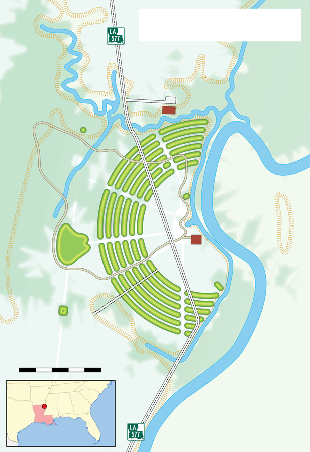 Reading the above, you’d expect the authors to set about disproving these claims. They do nothing of the kind, at least in this chapter. As we’ve seen, they demonstrate that there are ‘at least some’ examples to the contrary. The built environment from the pre-agricultural age is impressive in absolute terms. As the reader, I have no way of judging whether this is a trickle or a torrent. OK, it’s useful to note that Poverty Point (more pictures below) has a bigger footprint than Uruk – but do all the sites built by foragers in that period have a bigger footprint than all the sites built by farmers?