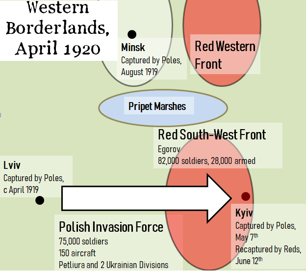 So the Polish and Soviet armies had been skirmishing for a year before the Polish invasion in 1920. Since the first clashes between Polish and Red troops took place as early as February 1919, the historian Norman Davies accuses other historians of ‘ignoring’ the ‘first year’ of the Polish-Soviet War. [8] It is Davies who here ignores the qualitative difference between the low-level conflict of that ‘first year,’ and the all-out war which began in April 1920 (This is a flaw in his generally great book).